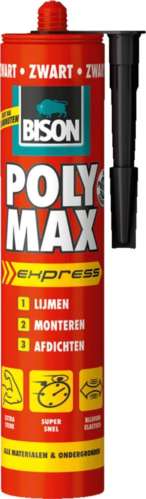 De Bison Poly Max Express is een universele, hoogwaardige montagelijm en afdichtingskit. Universele montagelijm en afdichtingskit met een snelle eindsterkte opbouw. De montagelijm is geschikt voor het lijmen, monteren en afdichten van vrijwel alle (bouw)materialen op vrijwel alle ondergronden (glas, poreus, niet-poreus). De montagelijm is zowel binnen als buiten te gebruiken en is extra sterk.