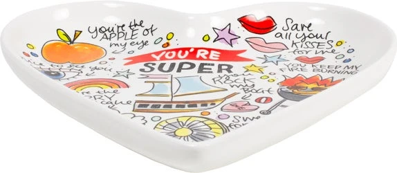 Vier Valentijnsdag met dit harten bord met allerlei teksten zoals “You’re super”, “Save all your kisses for me” en “You’re the cherry on my cake” van de nieuwe Valentijn collectie van Blond Amsterdam. Door de vrolijke teksten en illustraties op dit hartenbord kom je helemaal in de Valentijnsferen. Dit bordje is leuk te combineren met de andere Valentijn items, zoals de hartenkom, de mok en de minimokken. Happy Valentine!