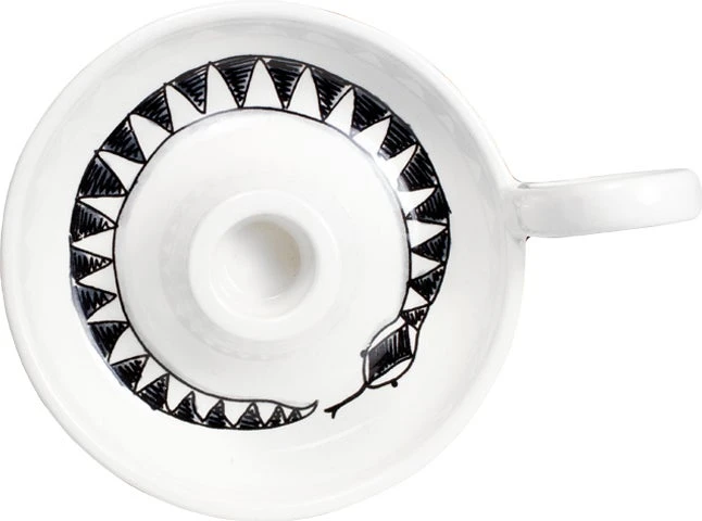 De zwart-witte tegenhanger Blond X Noir is groots uitgebreid. De herkenbare handcraft, met een ingetogener uitstraling vind je nu terug op nieuwe items. Zoals deze kaarshouder van aardewerk voor één kaars, met een zwartwit illustratie van een slang. Nu dus nog meer Blond Amsterdam voor wie minder van het bonte en blozende is.