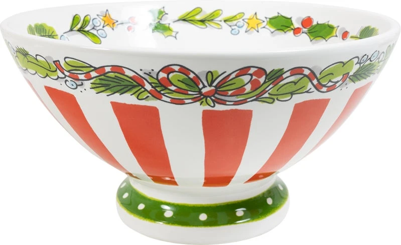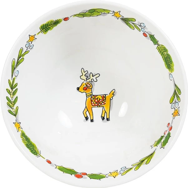 Deze vintage schaal vul je met heerlijke bijgerechten, soep of broodjes. De binnenkant heeft een gezellige krans en typische Blond illustratie en in het midden een afbeelding van een rendier. Aan de buitenkant staan rode strepen.