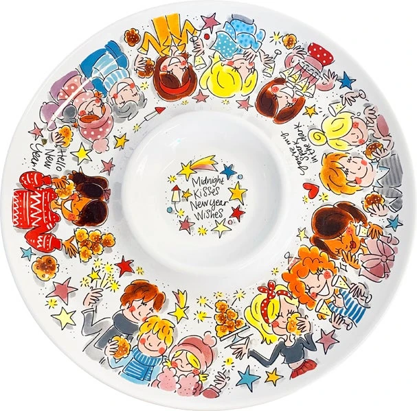 Happy New Year! Tel samen met Blond Amsterdam af naar 2023 met deze vrolijke snackschaal. Op de schaal staan allerlei typische Blond illustraties geïllustreerd in het teken van Oud & Nieuw. Serveer de lekkerste oliebollen en appelflappen op deze schaal voor een spetterend Oud & Nieuw feest. De schaal heeft een handig vakje in het midden voor een lekkere dip of dressing. Leuk te combineren met de andere feestelijke items van Blond Amsterdam.