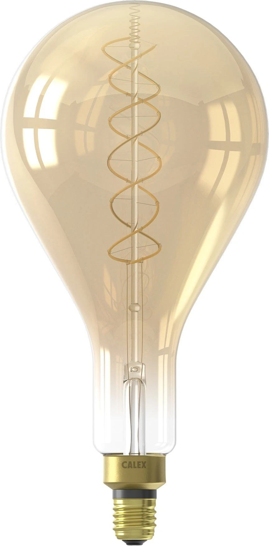 De Calex LED lamp Flex Filament Splash is bolvormig met spiraalvormige led filamenten aan de binnenkant. De gouden afwerking geeft deze lichtbron een klassieke uitstraling. Dit model komt het best tot zijn recht in een retro pendel. Deze kolossale blikvanger is een designstatement op zich. Ideaal voor gebruik in grote open ruimten en past bij elk interieur. De lamp verspreidt een extra warm licht en is dimbaar, waardoor je bij elke situatie eenvoudig de juiste lichthoeveelheid kan instellen. De lichtbron heeft een E27 fitting en de energieklasse is B. Het vermogen is 4 W en de lichtstroom 200 Lumen. De lichtbron is gemaakt van glas en geschikt voor binnen. De LED lamp heeft een diameter van 16,1 cm en een hoogte van 33 cm.