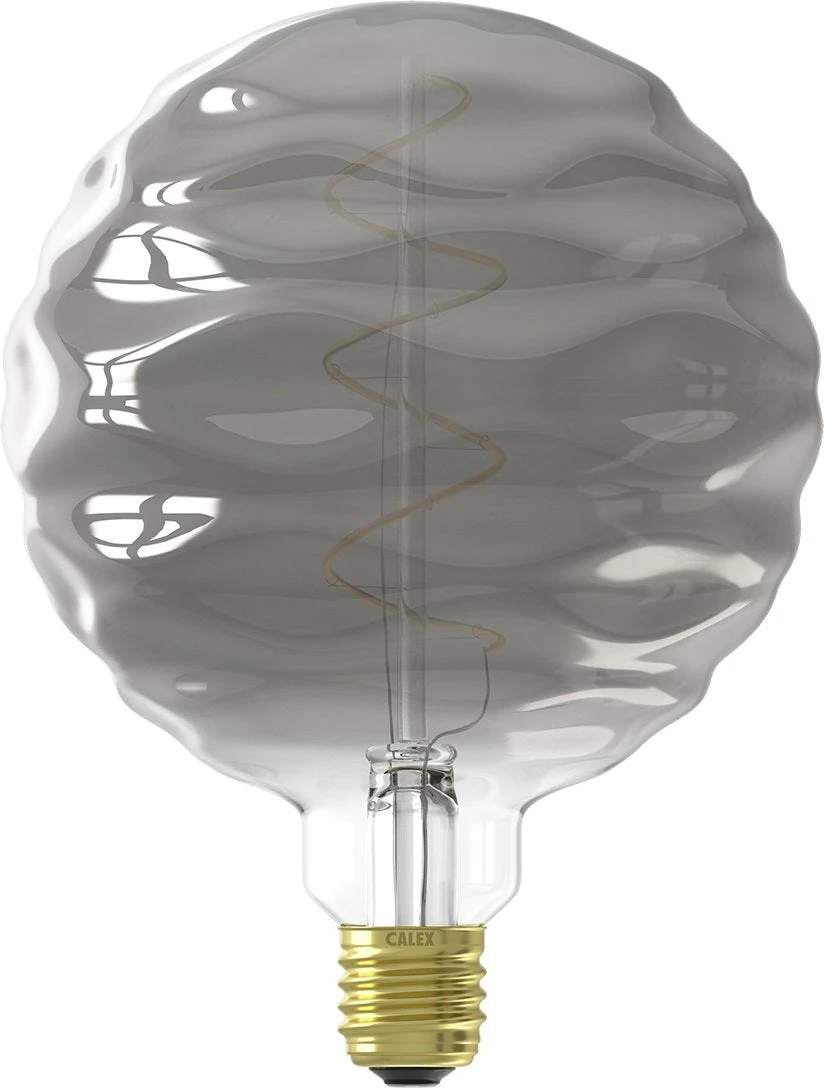De Calex LED lamp XXL Bilbao Titanium heeft een golvend water effect en een spiraalvormig led filament aan de binnenkant. De spiegelachtige titanium afwerking geeft deze lichtbron een klassieke uitstraling. Dit model komt het best tot zijn recht in een retro pendel. Deze kolossale blikvanger is een designstatement op zich. Ideaal voor gebruik in grote open ruimten en past bij elk interieur. De lamp verspreidt een extra warm licht en is dimbaar, waardoor je bij elke situatie eenvoudig de juiste lichthoeveelheid kan instellen. De lichtbron heeft een E27 fitting en de energieklasse is B. Het vermogen is 4 W en de lichtstroom 60 Lumen. De lichtbron is gemaakt van glas en geschikt voor binnen. De LED lamp heeft een diameter van 15 cm en een hoogte van 19,5 cm.