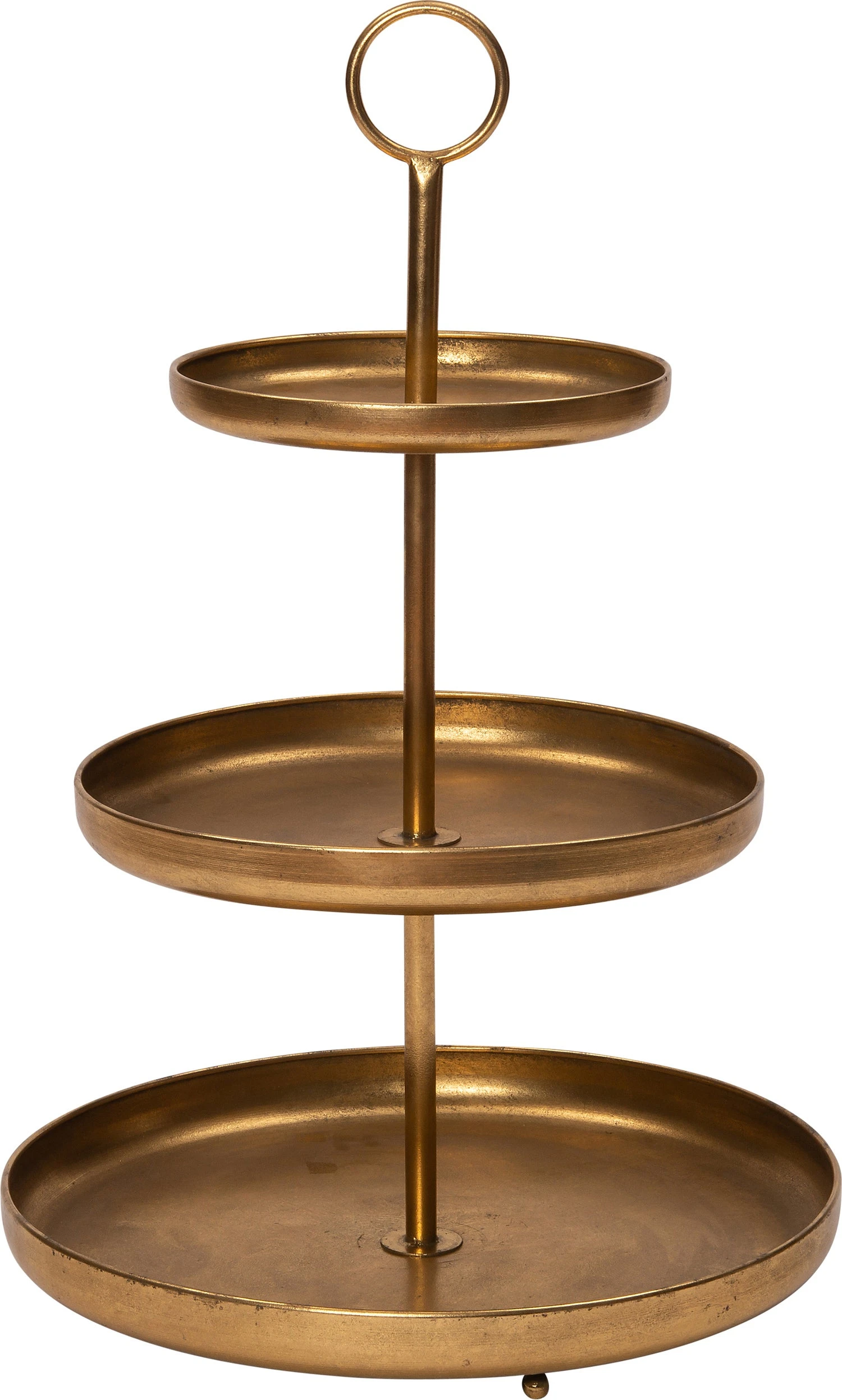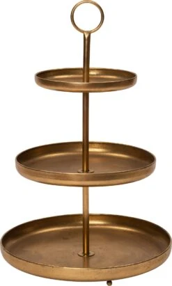 Etagère Jorin is het pronkstuk op tafel maar voor koekjes, bonbons of snoepjes is deze etagère net zo geschikt. De serveerstandaard is gemaakt van metaal en heeft een modern en speels ontwerp. Hierdoor is de etagère ook leuk om op tafel te zetten met bijvoorbeeld kaarsen. Jorin is uitgevoerd in een gouden kleur en past hierdoor zeer gemakkelijk in een chique interieur. De etagère is verkrijgbaar in twee formaten goud en in het zwart. De diameter van dit model is 41 cm met een hoogte van 62 cm.