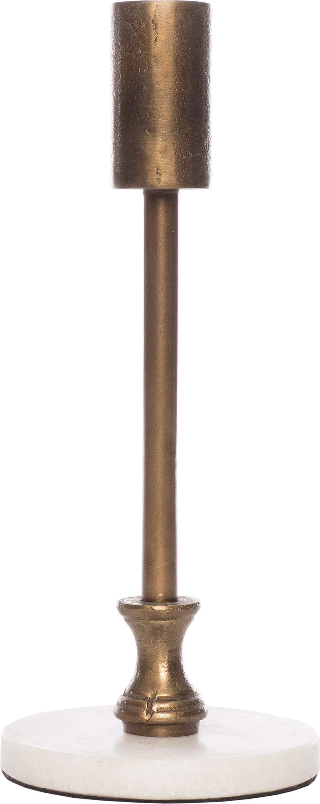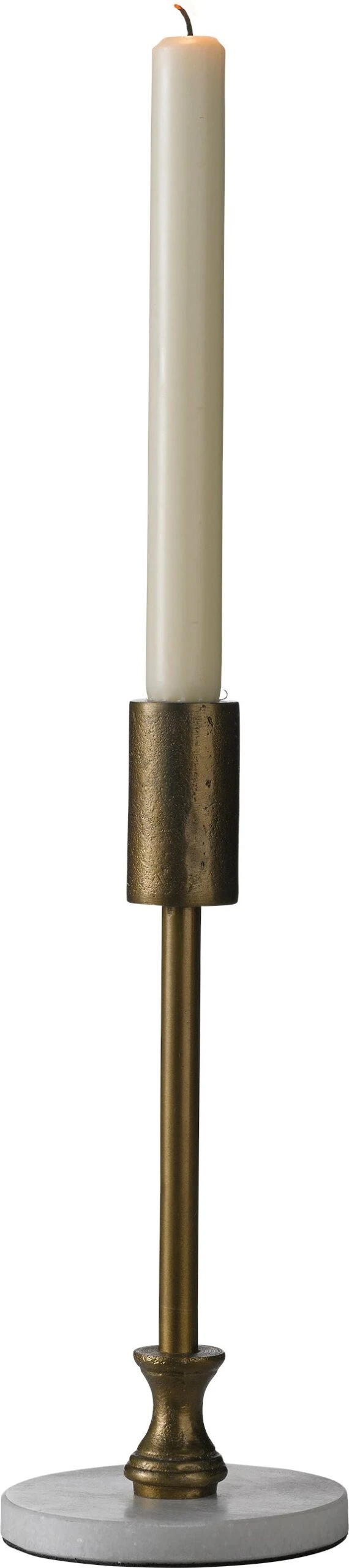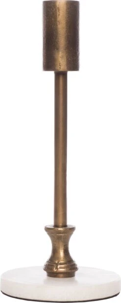 Laat je inspireren door onze nieuwe wooncollectie! Deze stijlvolle kandelaar is voorzien van een vintage uitstraling en is gemaakt van metaal in de kleur koper/goud. Een warme kleur die helemaal voldoet aan de trend van dit najaar. De marmeren voet maakt deze kandelaar uniek en is verkrijgbaar in twee uitvoeringen; vierkant en rond. Dit is de ronde uitvoering. De diameter van dit model is 11 cm met een hoogte van 28 cm.