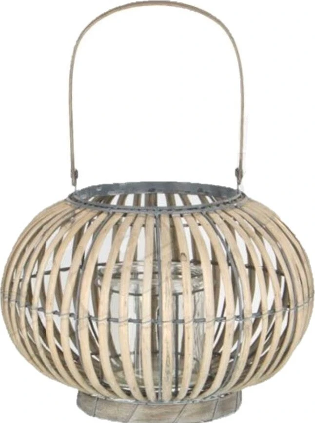 De windlichten van Intratuin zijn echte sfeermakers waarmee je het gemakkelijk extra gezellig maakt! Dit fraaie exemplaar gemaakt van riet in de kleur naturel met grijs heeft een glazen houder voor de stompkaars binnenin. Een prachtige sfeermaker in de woonkamer of in de tuin. Door het hengsel is het windlicht gemakkelijk te verplaatsen. Heb jij al een leuk plekje gevonden in de tuin of woonkamer? Tussen het frame bevinden open ruimtes, hierdoor kan het kaarslicht er goed doorheen schijnen. De diameter is 25 cm en de hoogte is 29 cm.