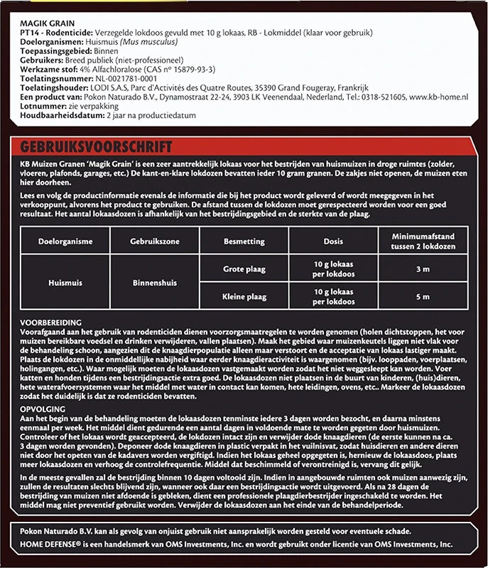 In één lokdoos zit 10 gram aan granen. In deze verpakking zitten 4 lokdozen. De lokdozen zijn direct klaar voor gebruik. Je hoeft de granen dus niet uit het plastic te halen. Muizen zullen zelf door het plastic heen eten. Afhankelijk van de omvang van de plaag zijn er meer lokdozen nodig. Eén lokdoos is geschikt ter bestrijding van 70 muizen.