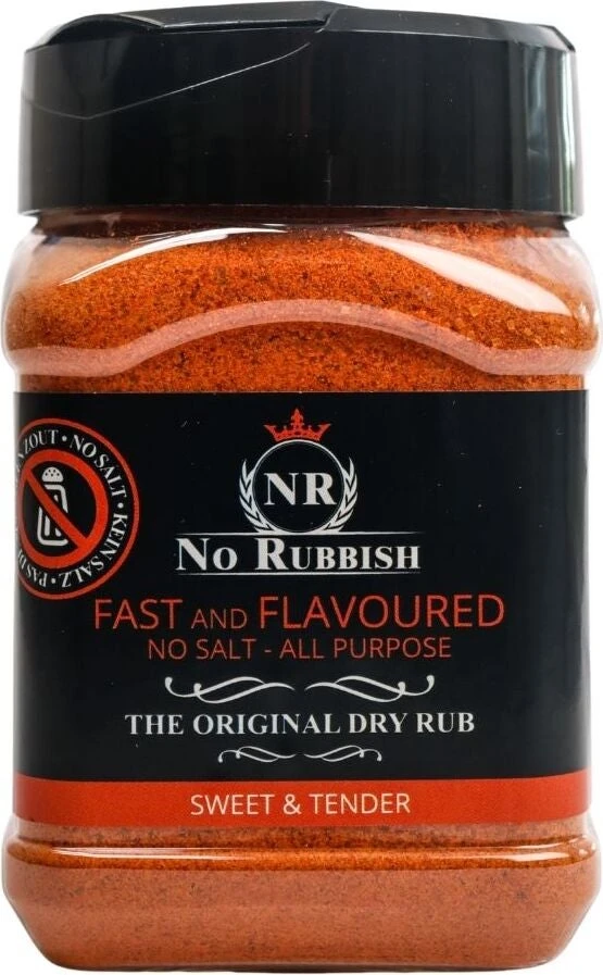 Deze brede Fast & Flavoured All purpose rub is overheerlijk op bijna elk gerecht. De rub past zich graag aan maar is zeker ook een tikkeltje eigenwijs. Prachtig in zijn eenvoud. Deze is zonder zout (ook leverbaar met zout). Ook wanneer je niet barbecuet, zijn deze kruiden lekker om te gebruiken bij een stukje vlees uit de pan. De No Rubbish Fast and Flavoured rub heeft een inhoud van 200 gram.